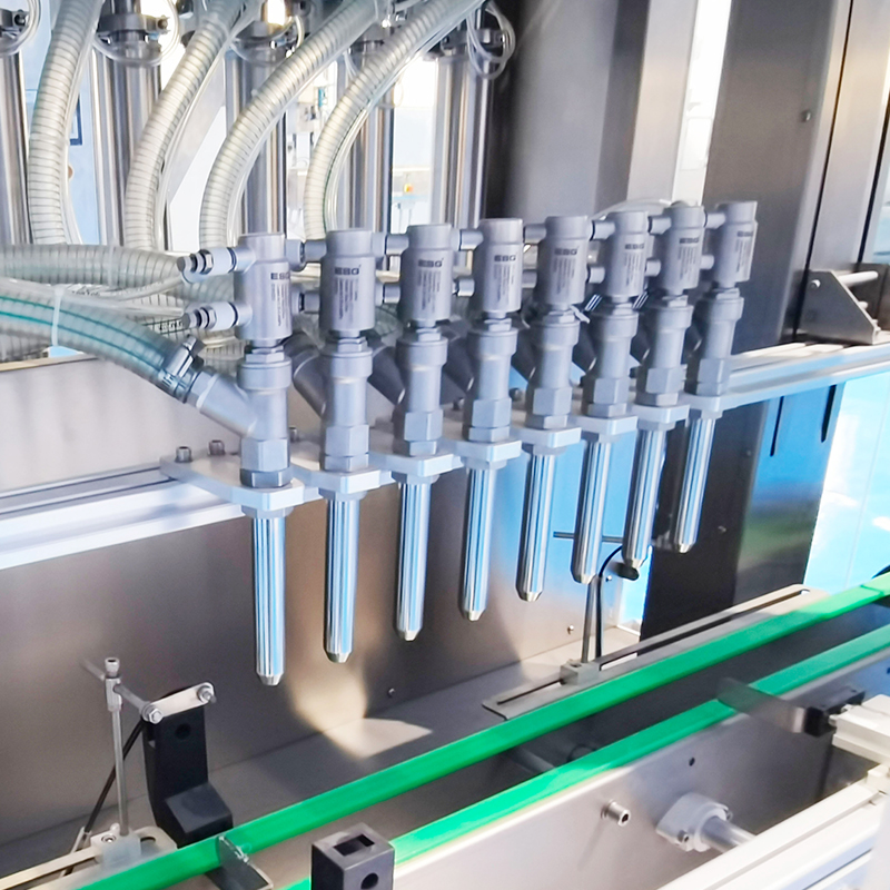3、防滴漏:灌裝頭部分采用氣動升降結構與回吸停流裝置,有效防止灌裝結束后藥液滴落污染瓶口與標簽。