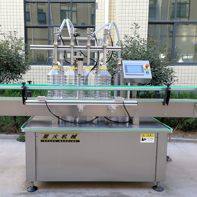 智能液體灌裝機主要由儲藏料斗、輸送管道、灌裝頭、液位控制器、輸送帶、防滴漏裝置等設備組成。食用油自動化灌裝機的整個工作過程全部處于智能操作條件下完成,它主要由PLC控制器配合彩色人機電腦顯示屏,正式工作前,工作人員應當提前將液體備至在儲料斗內,料斗中的液位高度控制著設備的灌裝速度和液體水平,所以在進入灌裝工作前,需要提前將灌裝規格設置在顯示屏幕當中,啟動機器后,液體將通過輸送管道被傳輸至灌裝頭,灌裝頭將會按照預設的灌裝量將液體精準的充填至容器當中,灌裝與預設規格一致的容量后,智能液體灌裝機會帶動產品進入下一個生產工序。